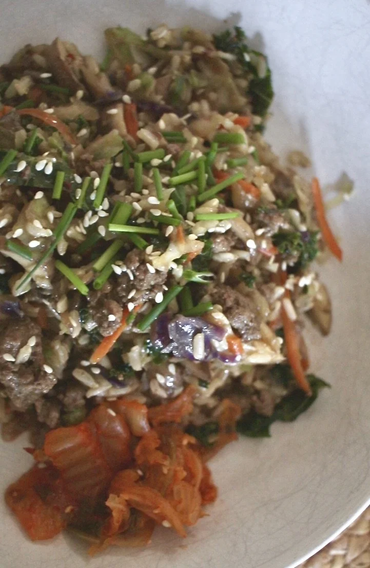 Once beef and cabbage mixture has cooked down, stir in cooked brown rice. Mix in 1 tsp sesame oil.